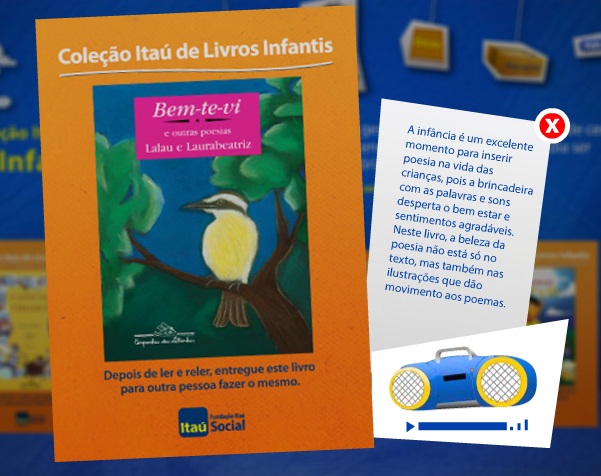 A coleção Itaú de Livros infantis é feita de 4 volumes, para você ler e reler com seus filhos, sobrinhos, netos ou alunos. Você assume o compromisso de ler um livro para uma criança e de repassar este livro para outra pessoa fazer o mesmo. Assim você criaum hábito que pode contribuir para que a criança escreva a sua própria história.
